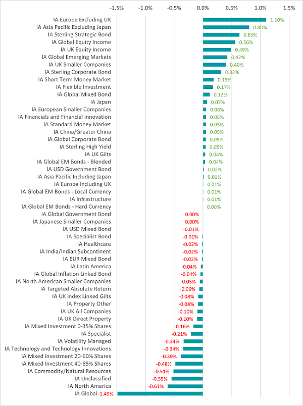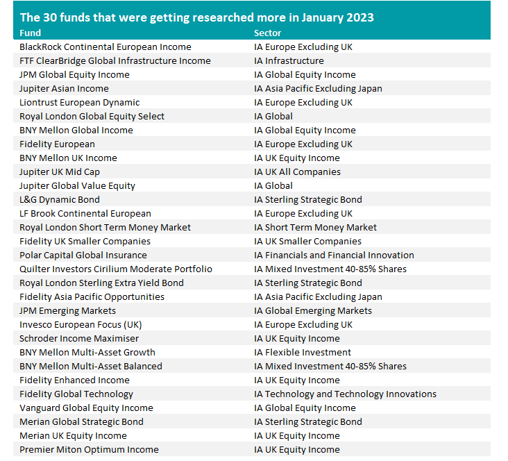 The other theme apparent in the chart is an increase in interest in equity income strategies as both the IA UK Equity Income and IA Global Equity Income sectors were being researched more in January relative to 2022.