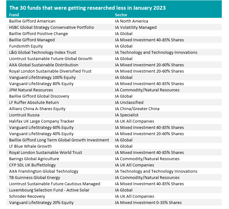 To find out which funds investors are becoming more or less interested in, we looked at the share of Trustnet pageviews each captured in January and compared with their share from 2022. The difference between the two allows to gauge their relative popularity with Trustnet users.