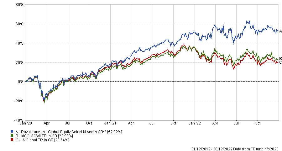 Total return of Royal London Global Equity Select vs sector and index over 3yrs to end of 2022