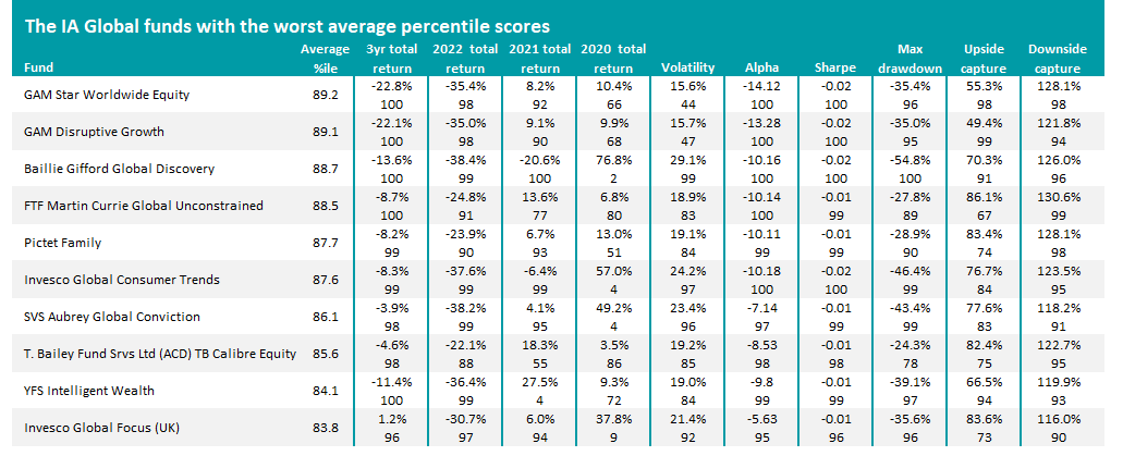 The most common benchmark for the sector was used for all of the funds (in the case of the IA Global sector, that’s the MSCI AC World index) and the lower the average percentile, the better the fund has performed overall.